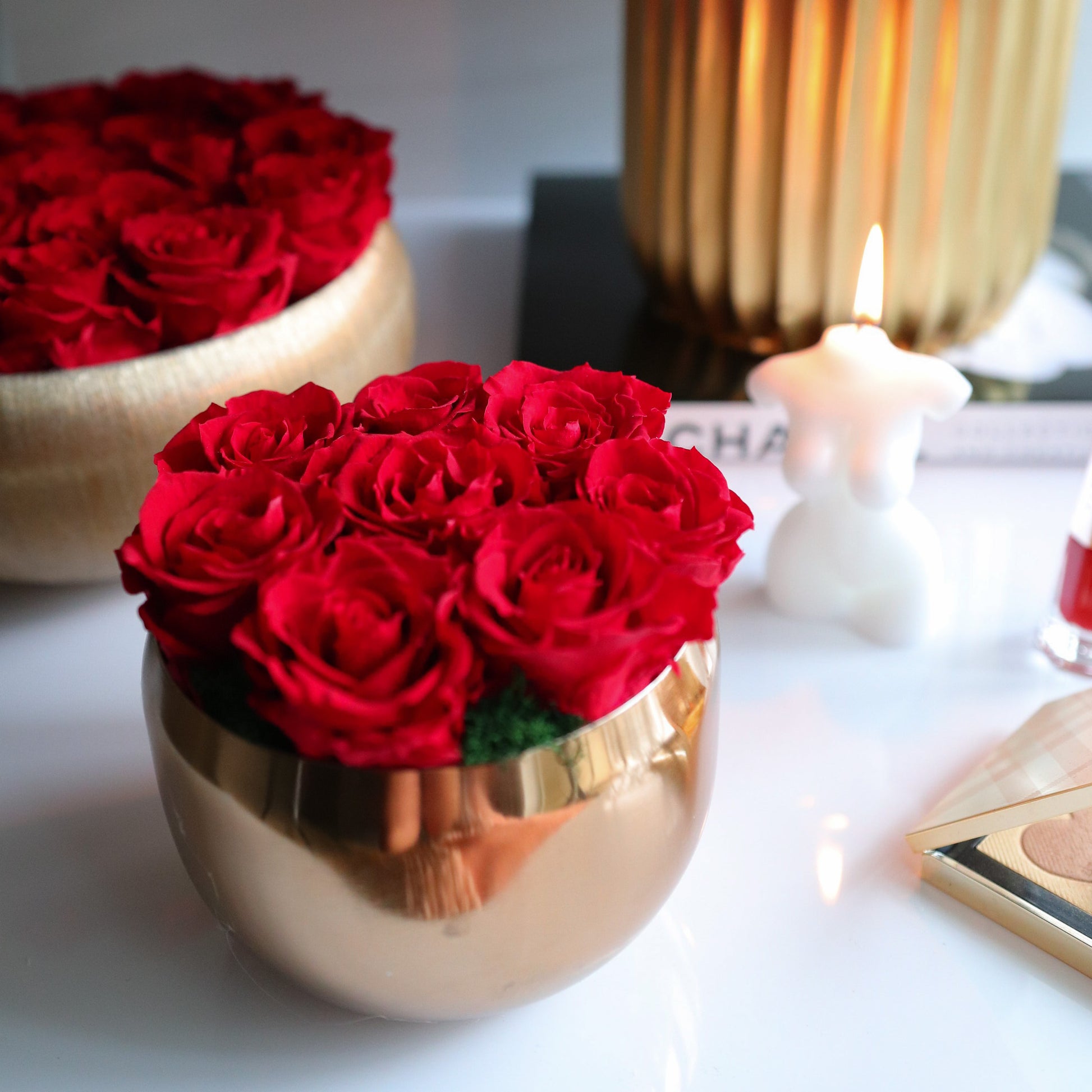 All the roses in our arrangements come from sunny Ecuador, where they are carefully preserved with natural oils to last over a year, and no maintenance is needed. Schedule your delivery date at the checkout, so you never miss important dates again!